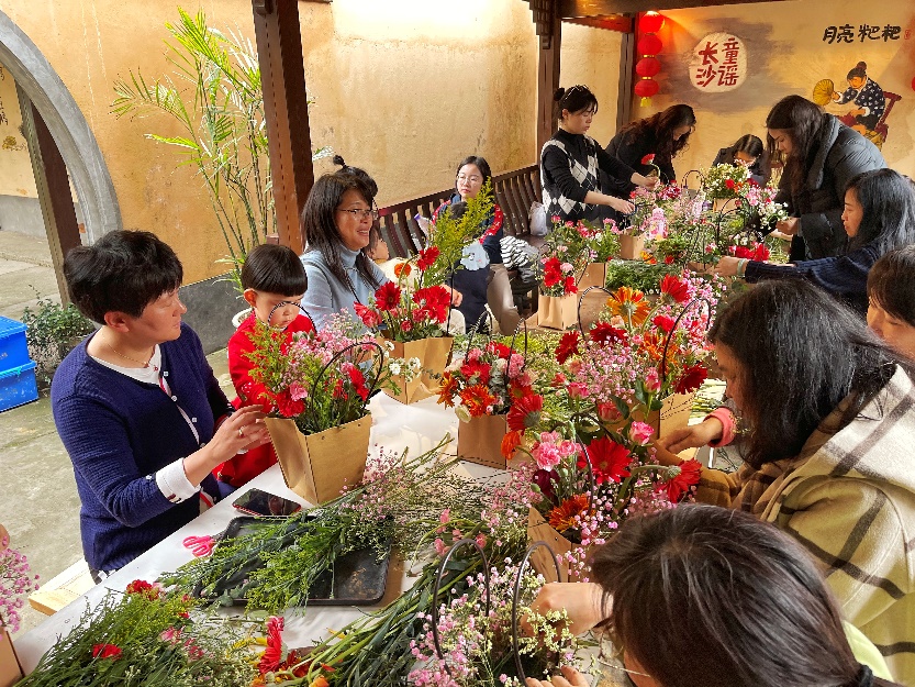 教职工“兵分两路”,插花小分队的女老师们剪接、绑枝、粘贴,大家忙得不亦乐乎。飘香的屋内荡漾着相互的交流声,时而传来欢笑声,时而传来欣赏声。笑颜如花绽,玉音婉转流。文化与女人交融,女人遇见最美的自己!