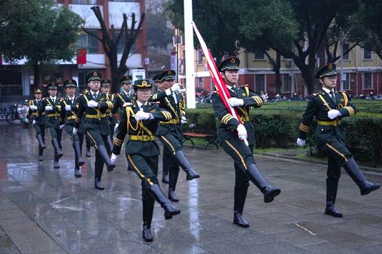 迎着晨光,伴随着庄重嘹亮的口令,升旗仪式于6时40分正式开始。国旗护卫队精神抖擞、步履铿锵,迈着整齐坚定的步伐,护送鲜艳的五星红旗稳步走向升旗台。激昂雄壮的《义勇军进行曲》响彻校园,五星红旗徐徐升起,全体师生肃立注目,齐声高唱国歌,满怀崇敬与赤诚,以青春之姿向祖国致敬。