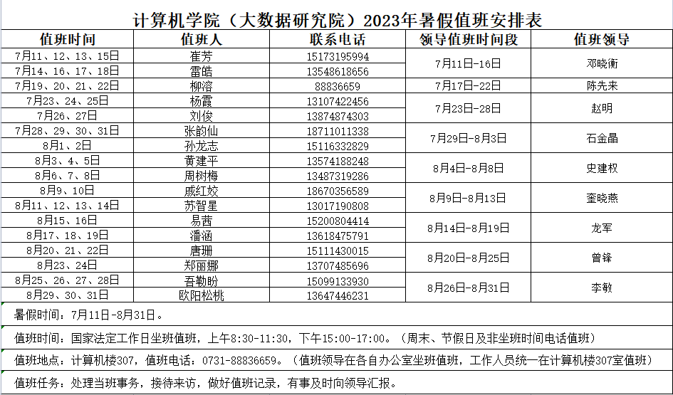 6. 严格遵守假期值班纪律。工作日安排值班人员(含带班领导)在办公室坐班,时间为上午8:30-11:30,下午3:00-5:00;周末、节假日及非坐班时间电话值班。遇有突发事件和重要紧急情况要及时准确报值班人员(值班表见附表1),并快速妥善处置。因工作纪律落实不到位,导致工作延误或造成不良后果的,日本av片