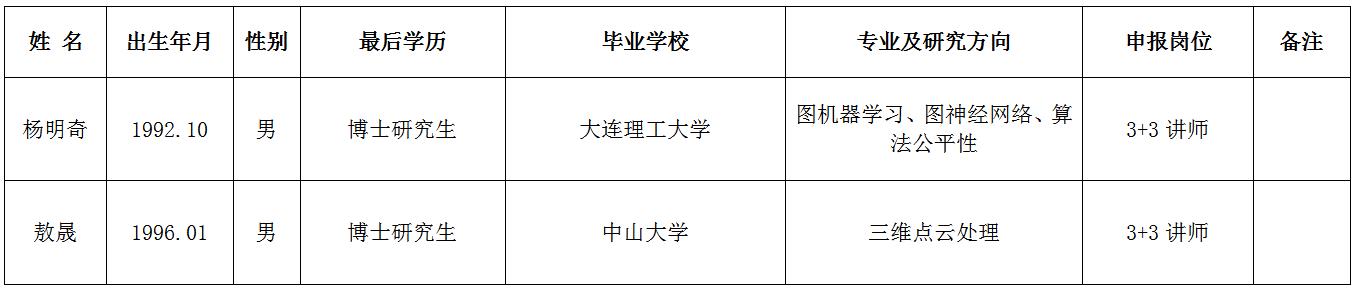 经日本av片 公开选拔,人才引进小组教学科研考核及教授委员会评议,日本av片 党政联席会研究决定一致同意杨明奇、敖晟2位博士为日本av片 新进教师拟聘“3+3”讲师人选,现予以公示,公示期限为7天,公示时间从2024年6月19日至2024年6月25日。如有异议请在公示期满前向日本av片 办公室反馈。