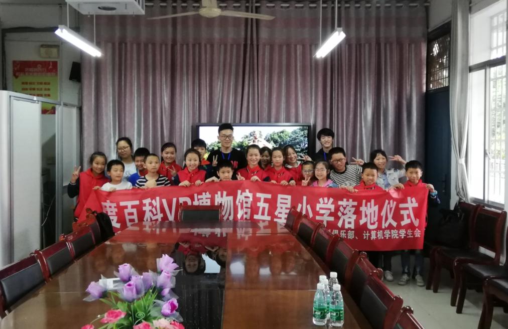 学生会主办的VR博物馆捐赠仪式在长沙市岳麓区五星小学成功举行,百度百科俱乐部部长田雨茂,新媒体部李春,活动部吴逍卓、李屹洲与五星小学校长彭德良出席捐赠仪式。