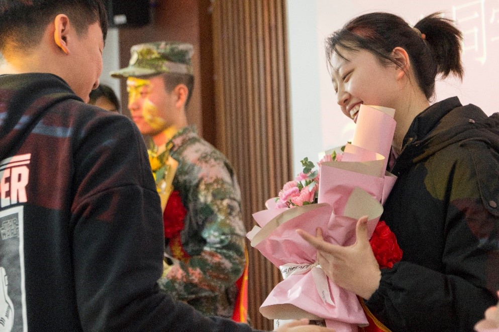 赠送礼品。之后本班同学也为他们送上了寄托着祝福的鲜花。