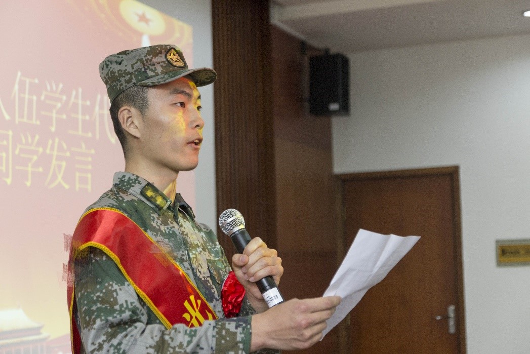 退役学生代表曹泽榆寄语新兵们要永葆不屈不挠的斗志、英勇顽强的胆魄和永不放弃的精神。他希望新兵们在部队要在训练与工作生活中严于律己,戒骄戒躁,尽职尽责,学会团结同志,并对新兵们即将迎来的军营生活表示热切的祝福。