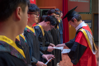 典礼第二部分,各系代表教师为毕业生授予学位。毕业生们依次走上讲台,接受正冠拨穗、授予学位并与师长合影留恋。