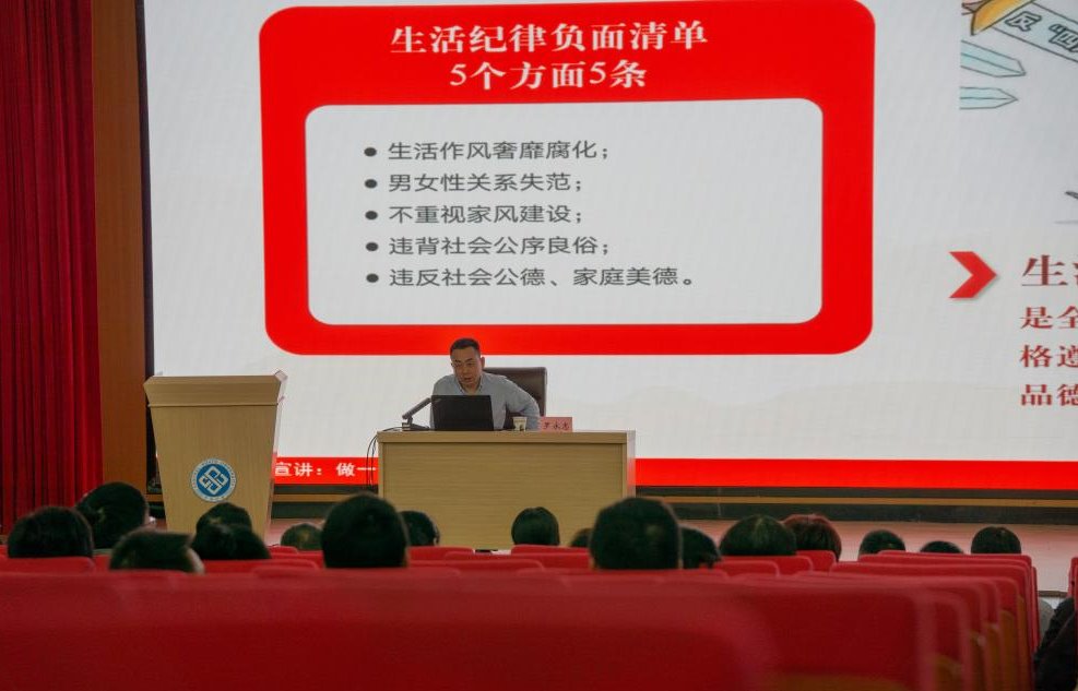 罗永忠副书记从保持清醒头脑,自觉遵守廉政“红绿灯”;明纪知纪守纪,从紧从严从实恪守纪律;强化责任担当,营造风清气正发展环境三个方面对如何做好一个严守纪律的中南人进行了全面深入的宣讲。罗书记用生动而严谨的语言,以幽默与严肃巧妙结合的方式,重点对违反党的政治纪律、组织纪律、廉洁纪律、群众纪律、工作纪律、生活纪律的负面清单、具体表现和典型案例进行了阐述,进一步增强了同志们的责任意识、忧患意识、法纪意识和底线意识。