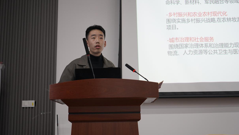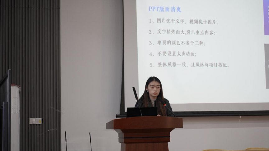 的王楠同学以“通过赛道,走向旷野”为主题,分享了自己的竞赛经验。她围绕“讲好故事”,“注重实践,凸显自身工作”,“青年精神,家国情怀”三方面进行详细解读,帮助同学们理清思路的同时提供了有关选题、商业计划书、PPT制作等方面的建议,并详细介绍答辩环节准备工作,为在座同学提供了实用的参赛技巧。