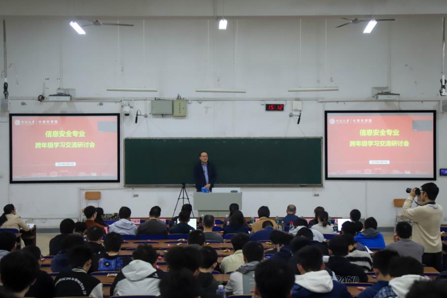 在3月27日于新校区D座123举办了信息安全专业跨年级学习交流研讨会。院党委书记赵晓霞,党委副书记王新辉,副院长黄家玮,学生工作办公室主任师雷宏,教务办主任戚红姣,网络空间安全系党支部书记段桂华,网络空间安全系主任张士庚,网络空间安全系副主任王森章、宋虹,网络空间安全系全体教师,各年级辅导员出席了本次会议。信息安全专业全体在校本科生参加了本次会议。