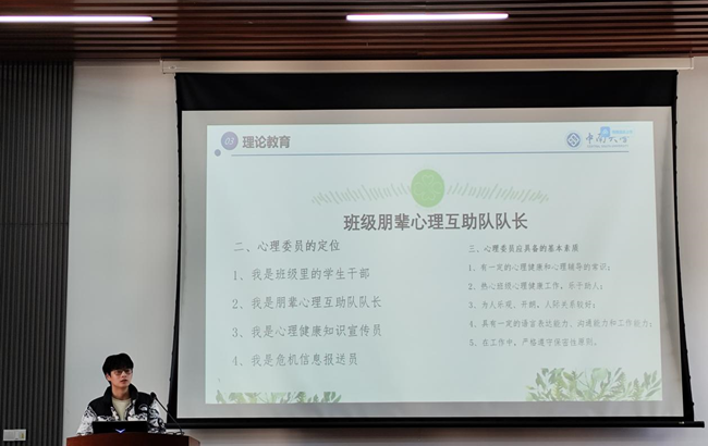 随后,王建中主席进行了理论知识的深入讲解。他首先阐释了心理委员的角色定位和所需的基本素质,并通过图例详细讲解了如何区分正常与异常心理状态,心理健康评估标准,以及心理问题严重性的判别方法与应对策略。此外,主席还展示了心理问题在生理、行为、认知方面可能引发的反应,并对心委们提出了具体的工作要求。