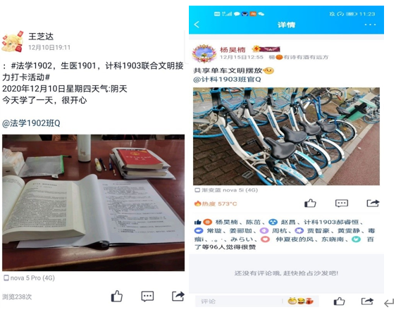 为了让同学们更好地理解文明校园的意义,三个团支部分别号召同学们进行了为期三周的“文明打卡”活动,在团日活动上潘新俞同学对这次打卡活动中大家积极参与表示了感谢,并希望同学们能够坚持自己的文明行为。活动接下来继续介绍了活动的前期宣传,包括张贴海报,在微信、微博等流媒体上发表宣传文案,在朋友圈转发团日活动策划等等。