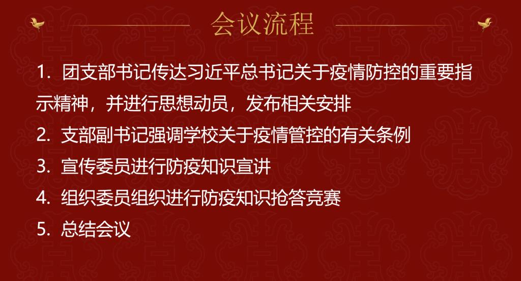 此次会议传达了习近平总书记关于疫情防控的重要指示精神,动员团员们一定要坚决克服麻痹思想、厌战情绪、侥幸心理、松劲心态,做到守土有责、守土尽责;助力校园抗疫工作,发挥基层团支部战斗堡垒作用,引导广大团员青年携手做好校园抗疫工作。软件工程2004团支部全体团员们将以身作则,切实筑牢校园疫情防控安全线,做到疫情防控与学习生活两不误,沉着冷静面对疫情,众志成城抗击新冠。